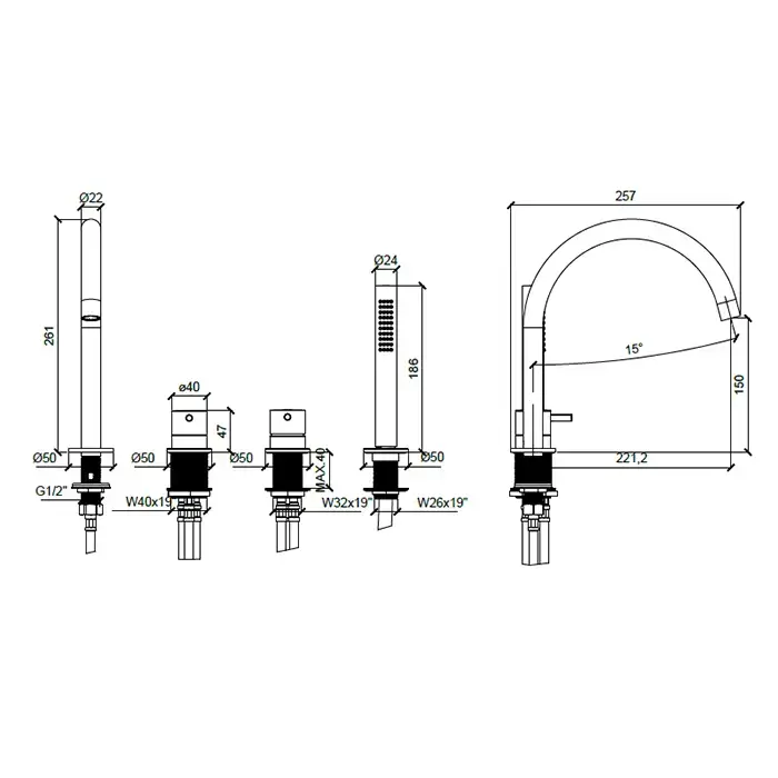 ALMAR Смеситель на борт ванны на 4 отверстия с ручной лейкой, цвет хром