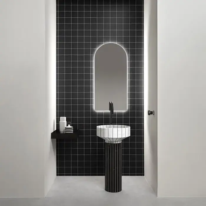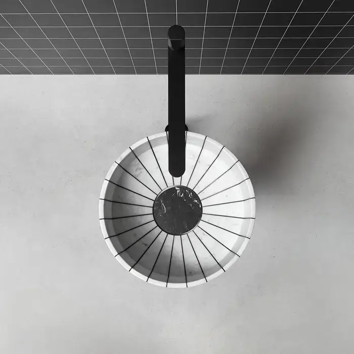 ANTONIO LUPI 024 Раковина напольная Ø450х850 мм., слив в пол, с сифоном, гибким шлангом и донным клапаном, пьедестал Nero Marquinia, раковина Carrara