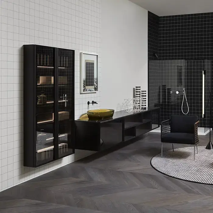 ANTONIO LUPI BEMADE Пенал 450х216х1750 мм, подв, левый, 1 дверца, 5 полок с подсв, бок слева Rovere ardesia, рама Nero matt, фронт стекло Reflect fume