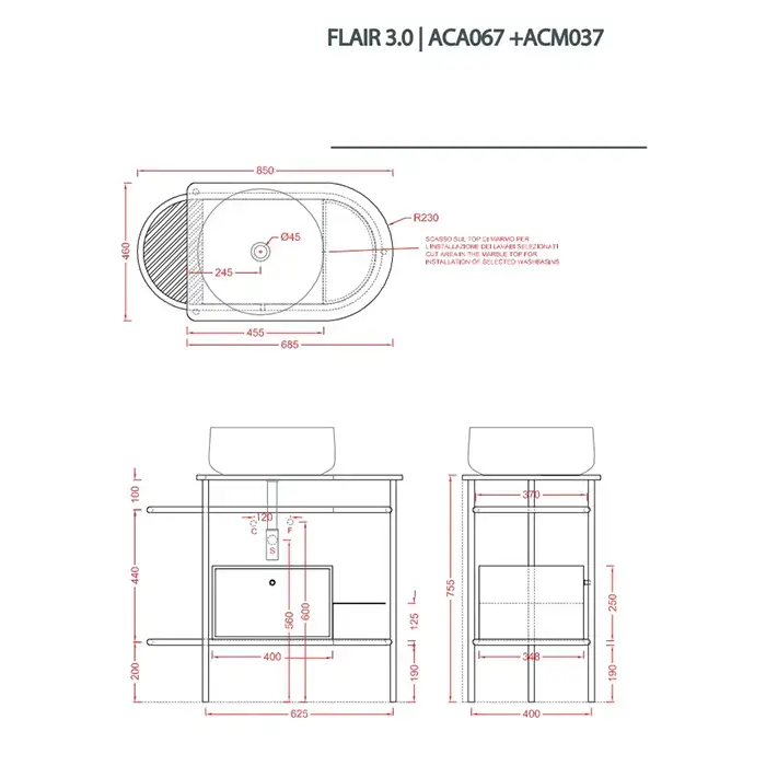 Artceram Flair 3.0 Металлическая консоль с раковиной, 85х46х75.5см., напольная, с выдвижным ящиком и мраморной столешницей, цвет: белый матовый