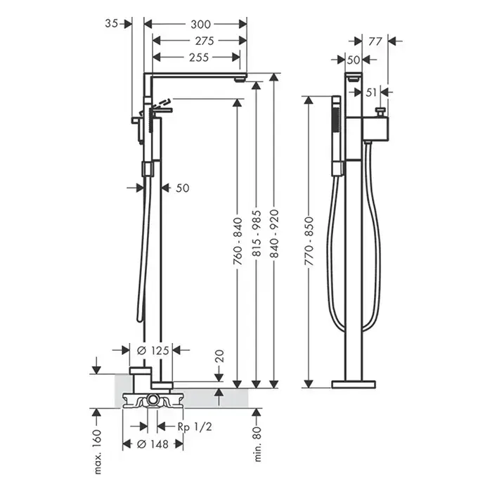 Axor Edge Смеситель для ванны, напольный, с ручным душем, излив 255мм, внешняя часть, цвет: черный