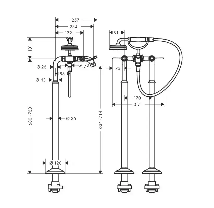 Axor Montreux, Смеситель для ванны, с двумя рычаговыми рукоятками, напольный, внешняя часть, цвет: хром