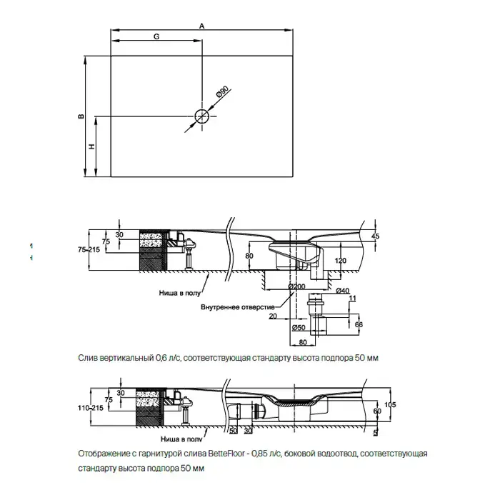 BETTE Установочная система UNIVERSAL для установки поддона 800х800 мм, высота регулировки: 75-215 мм