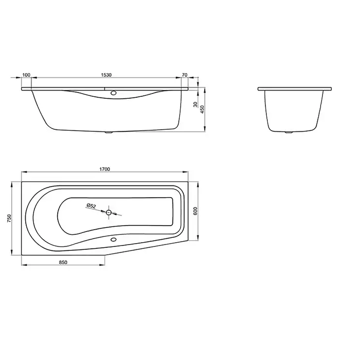 Bette Luna Ванна прямоугольная с шумоизоляцией 170х75х45 см, область ног справа, с покрытием антислип, BetteGlasur® Plus, пристенная, цвет: белый