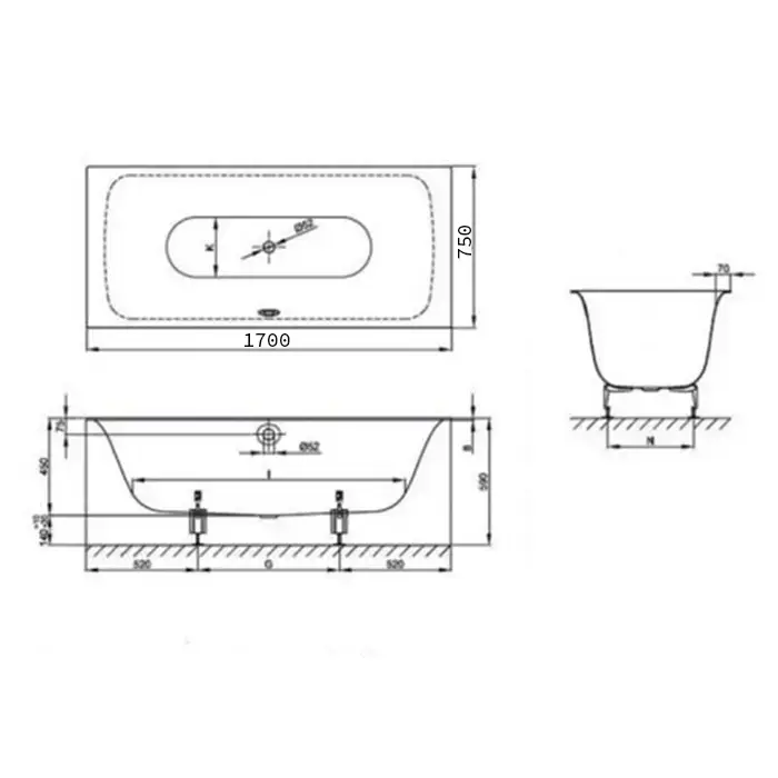 Bette Lux Ванна прямоугольная с шумоизоляцией встраиваемая, 170x75x45см, с самоочищающимся покрытием BetteGlasur ® Plus, цвет: белый, (для удлиненного слива-перелива)