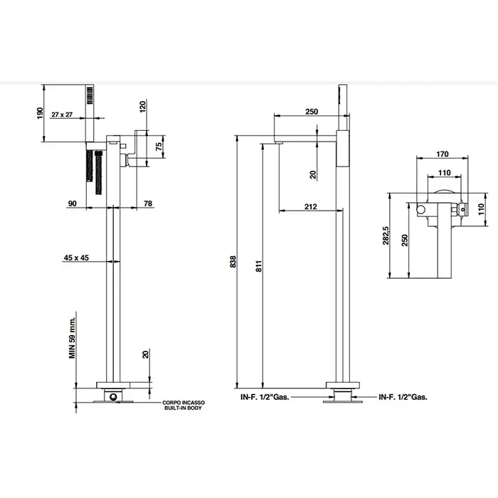 Bongio Line Смеситель для ванны с душем напольный, излив 21,2 см, цвет: хром 67534CR0DPREU