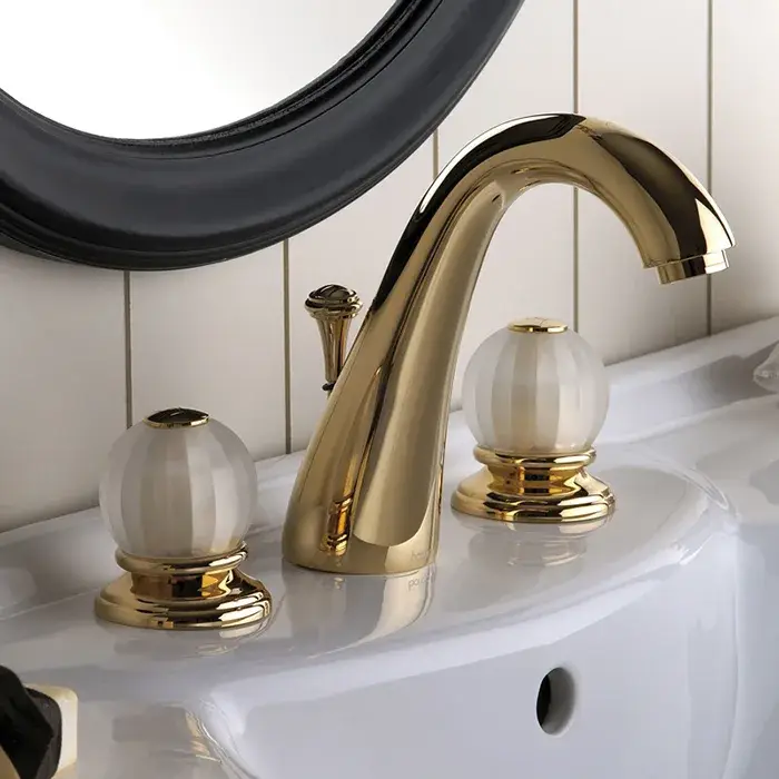 Bongio Rivoli Смеситель для раковины на 3 отверстия, ручки стекло белое, цвет золото 05501OR00