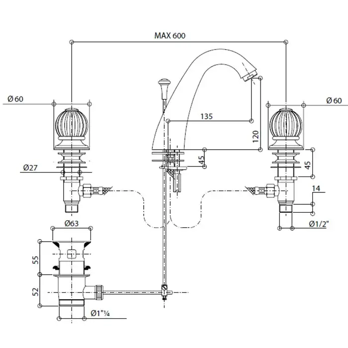 Bongio Rivoli Смеситель для раковины на 3отв., цвет хром/Cristallo Bianco 00 05501CR00