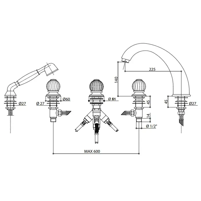 Bongio Rivoli Смеситель на борт ванны, на 5 отверстий, с ручным душем, цвет: золото 05531OR00D