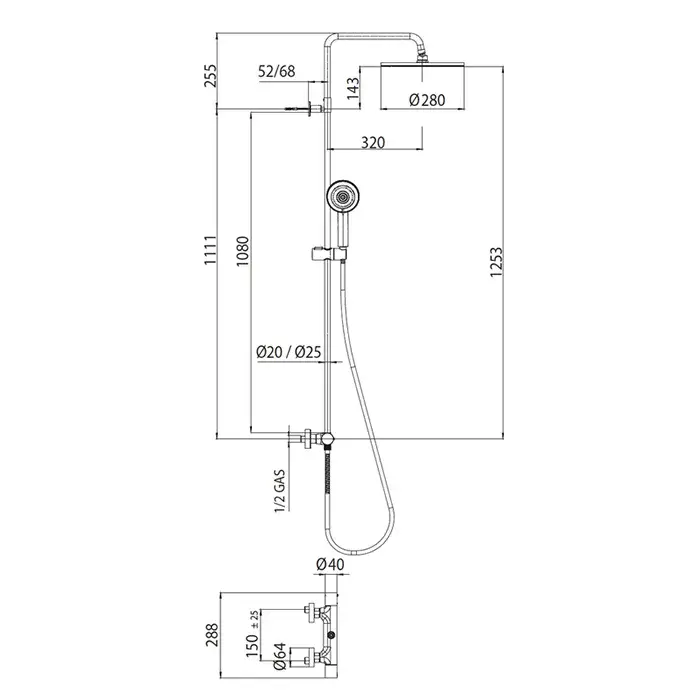 Bossini Elios Душевая стойка: смеситель, ручной и верхний душ, 1 вид струи, шланг, цвет: chrome L10010.030
