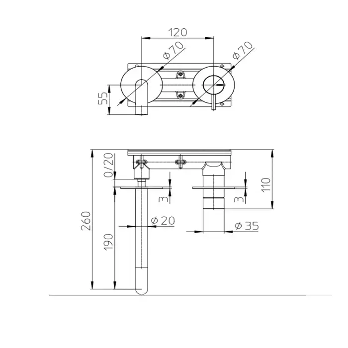 Bossini Nobu Смеситель настенный, на 2 отверстия, с изливом 190 мм, без донного клапана.., Mat brushed S.S.(внешняя часть)