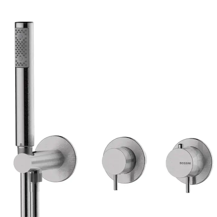 Bossini Nobu Встраиваемый термостат. смеситель для душа Nobu, с перекл.на 2 вых, душ. набор Zen-Inox с гибким шлангом Cromolux 150 см.Mat brushed S.S.
