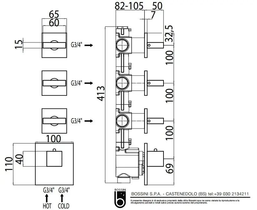 Bossini Встраиваемая часть с 3 запорными клапанами, 3 потребителя Z030202000