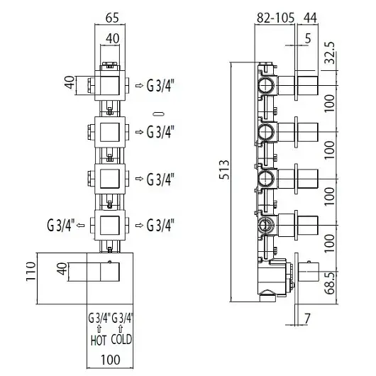 Bossini Встраиваемая часть с 2 запорными клапанами и девиаторами, 4 потребителя Z030271000