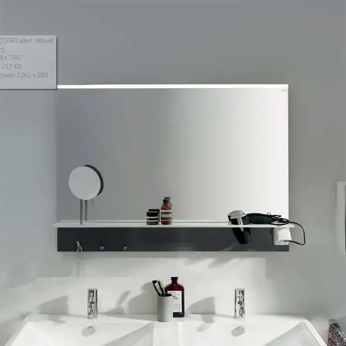 BURGBAD Eqio Зеркало с полкой , светодиод подсв.90х76.9х15см,выкл сбоку справа, 3 крючка, держ для фена справа. цвет серый F2010