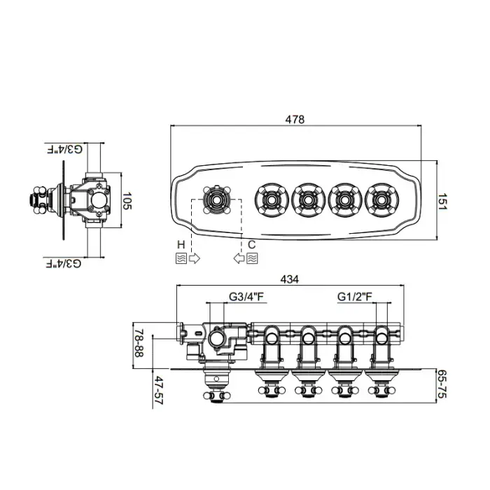 Carimali COLONIAL Внешняя часть горизонтальная для термостатического смесителя с 4-ю независимыми выходами, цвет хром