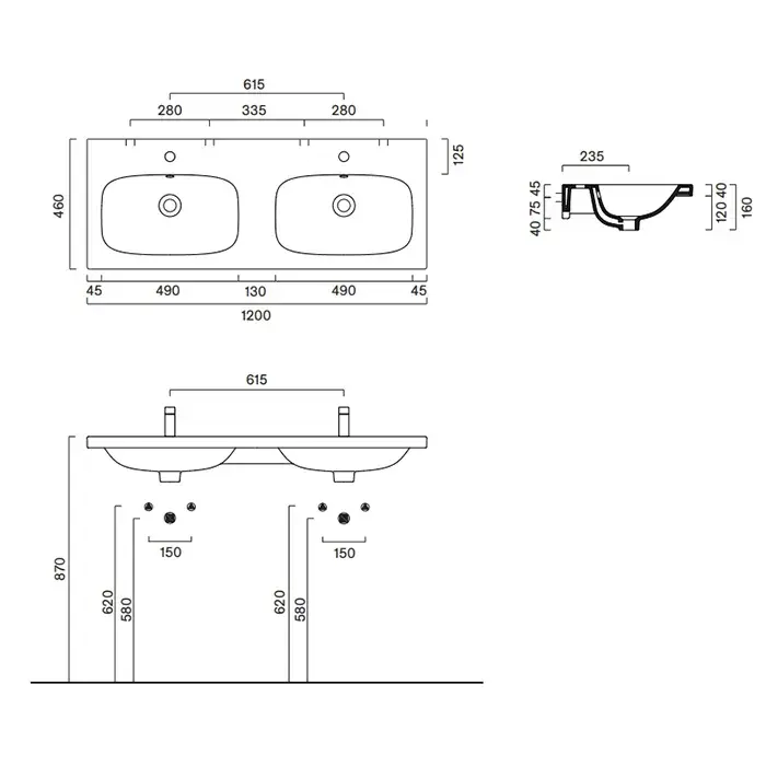Catalano Alvea Раковина двойная 120х46 см, 2 отверстия под смеситель, перелив, цвет: белый глянцевый 0621222001