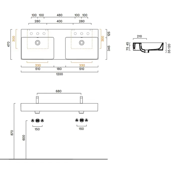 Catalano Premium Раковина двойная 120х47см, подвесная, без отв., цвет: белый глянцевый