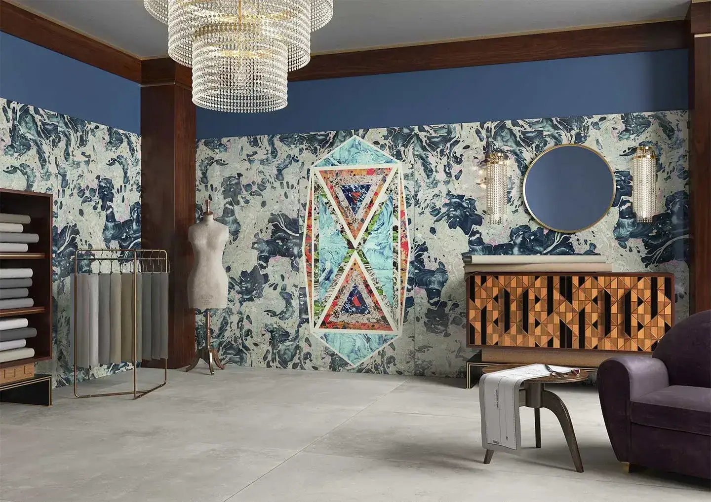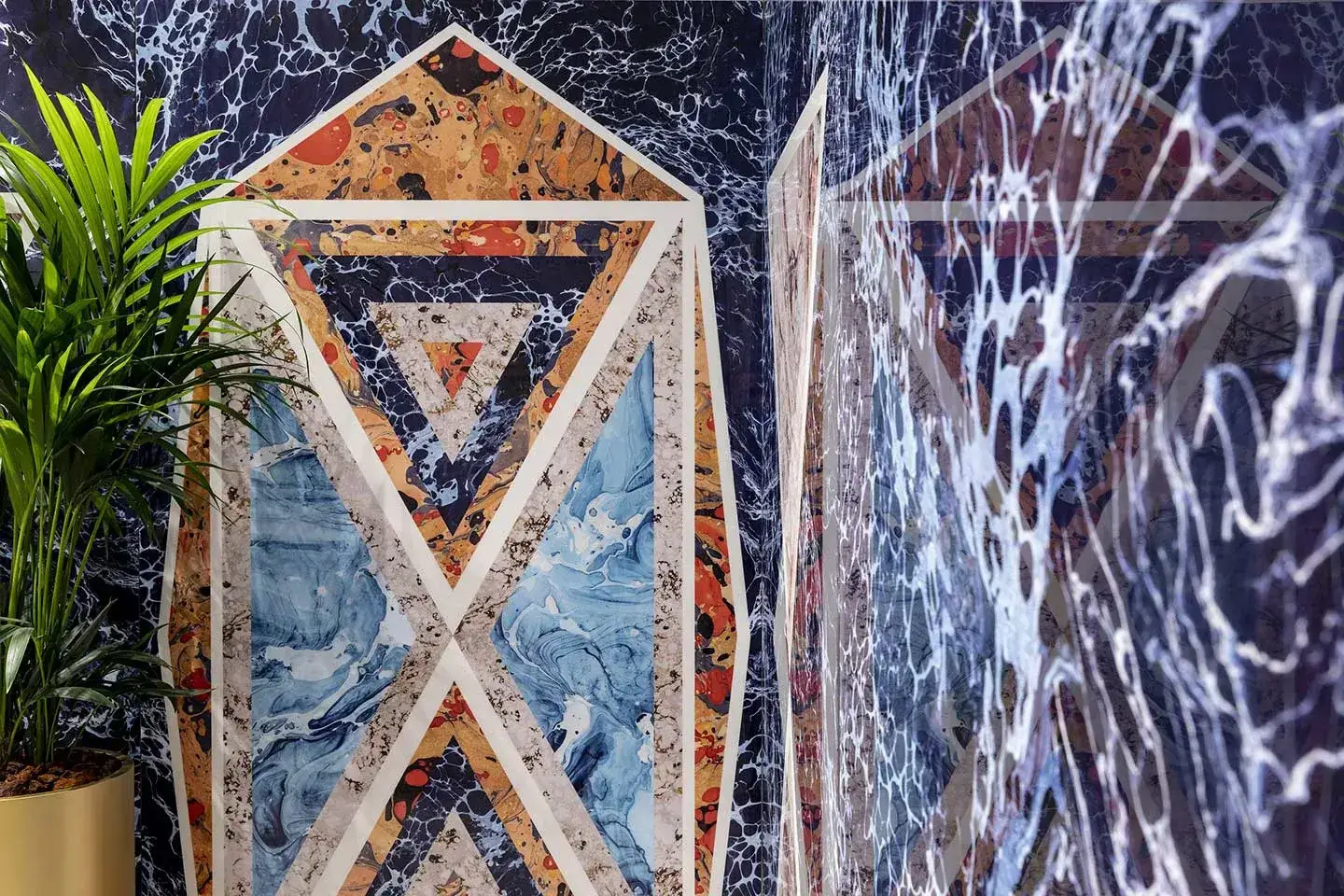 Керамогранит 763514 Araldica Triangoli Blu Lucida R 6mm 120x240