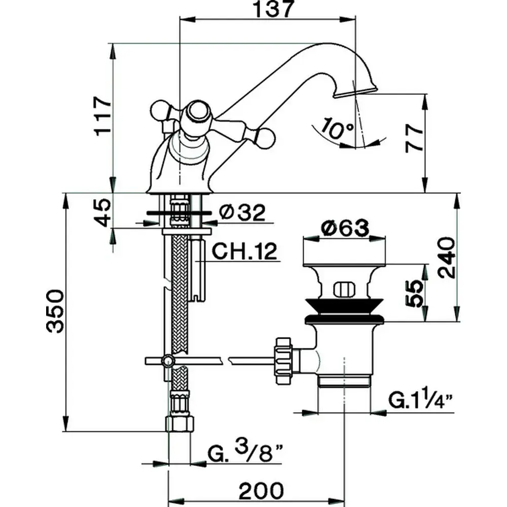 Cisal Arcana America Смеситель для биде на 3 отверстия, с донным клапаном, цвет: Chrome AA00102021