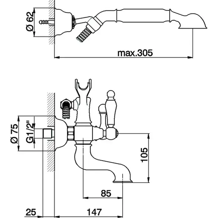 Cisal Arcana Toscana Смеситель настенный для ванны с ручной лейкой, цвет: Chrome TS00012021