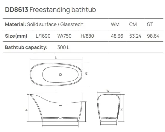 Dea Design Elegant Ванна 186x78x94см., отдельностоящая, Solid Surface, цвет: White №18