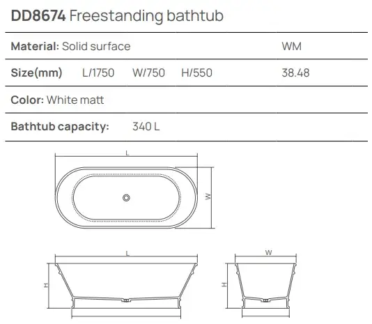 Dea Design Shadow Ванна из Solid Surface отдельностоящая 175x75 см, цвет: white DD8674 1750 18