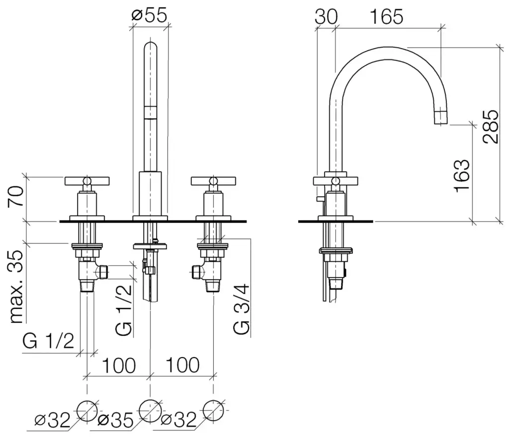 Dornbracht Tara Внешняя часть смесителя из стены на 3 отверстия, с вентилями, излив 16см, цвет: хром 36707892-00