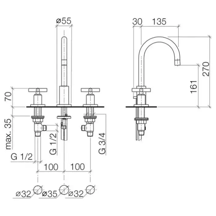 Dornbracht Tara Смеситель для умывальника на три отверстие, вылет 13,5 см, цвет: хром 20710892-00