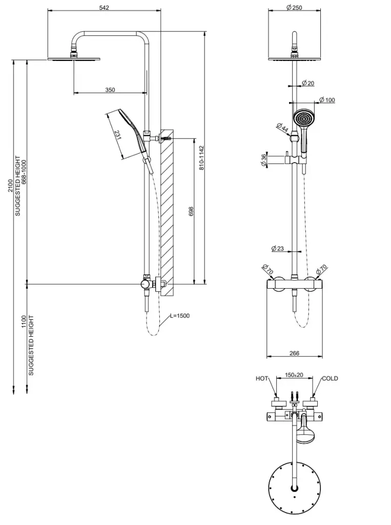 Душевая система с термостатом, с переключателем, верхним душем d.25 см, держателем, ручным душем и шлангом 1,5 м GESSI MINIMALISTIC SHOWER