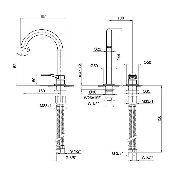 Fantini AL/23 Смеситель для раковины, 2 отв., без донного клапана, излив 160мм, цвет: хром