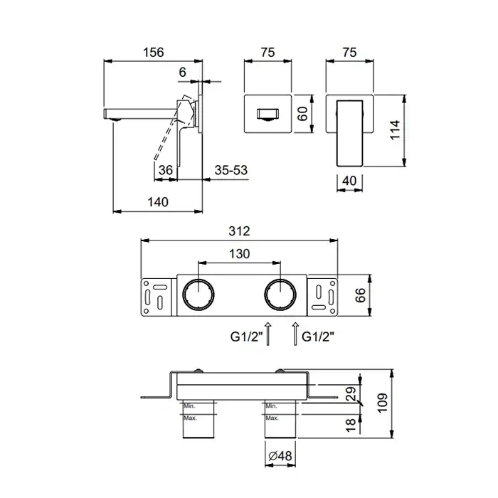 FANTINI MINT Смеситель для раковины настенный, однорычажный, излив 140 мм., внешняя часть, цвет черный матовый