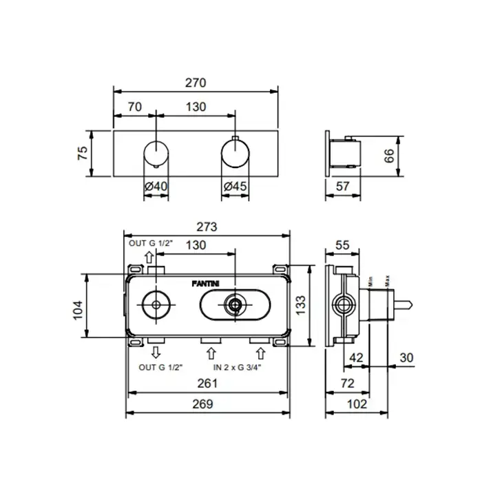 Fantini Nostromo Смеситель для душа, термостатический, встраиваемый, на 2 потока , с поворотной ручкой, цвет: Matt Copper PVD