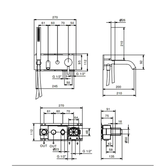 FANTINI NOSTROMO Смеситель для ванны, встраиваемый, однорычажный, с ручным душем и шлангом 1500 мм., внешняя часть, цвет Matt British Gold PVD