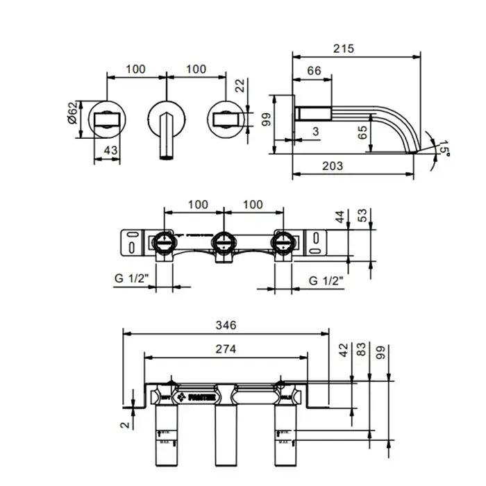 Fantini Venezia смеситель настенный -наружная часть, без ручек, цвет золото плюс