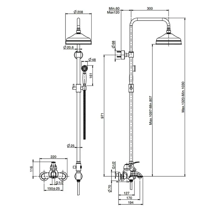 Смеситель, Верхний душ, Лейка, Штанга, Шланг