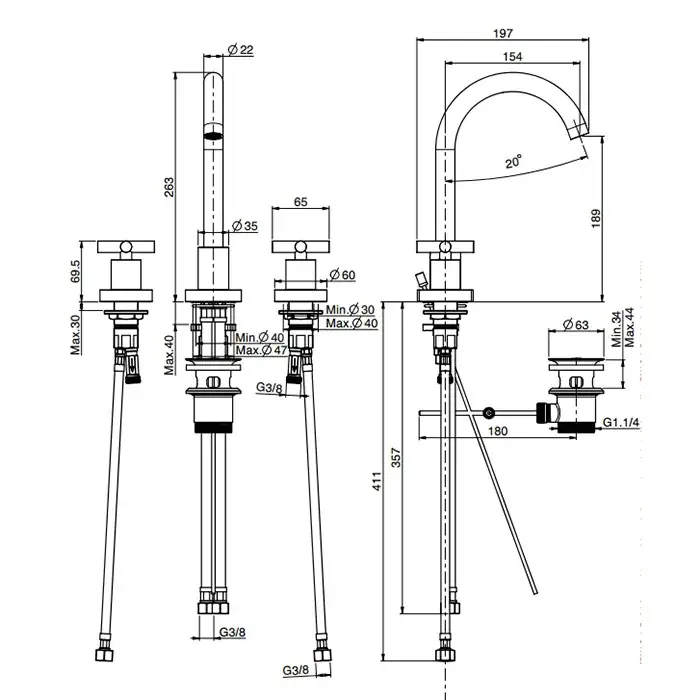 Carlo Frattini Maxima Смеситель для раковины, встраиваемый, на 3 отв., излив 20см., внешняя часть, с донным клапаном, цвет: хром