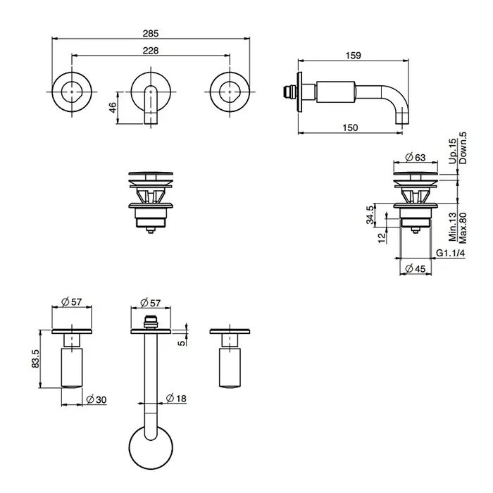 Fima Carlo Frattini So F3191/5CR Смеситель для раковины настенный, на 3 отв, излив 150 мм., донный клапан click-clack, цвет: хром