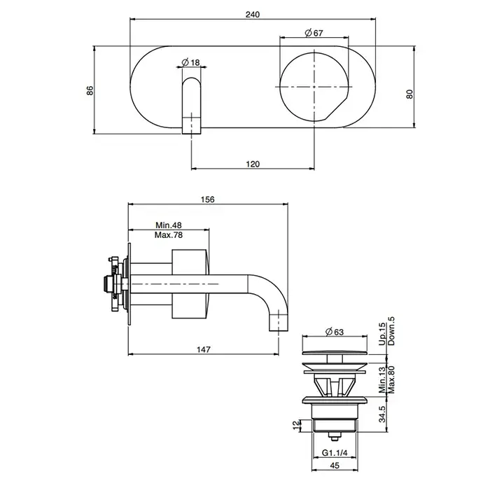 Fima Carlo Frattini So F3191/5CR Смеситель для раковины настенный, на 3 отв, излив 150 мм., донный клапан click-clack, цвет: хром