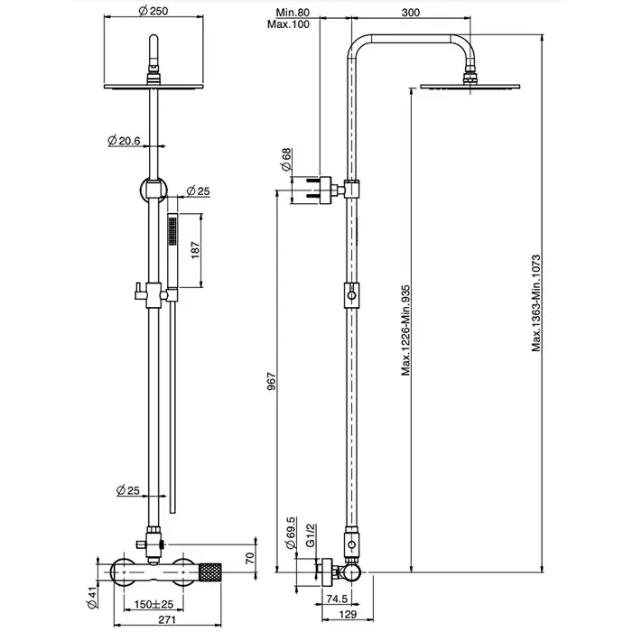 Смеситель, Верхний душ, Лейка, Регулируемая по высоте штанга, Шланг Chromalux