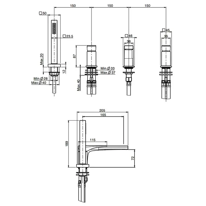 Fima Carlo Frattini Zeta Смеситель на борт ванны, на 4 отв., с ручным душем, цвет: черный матовый