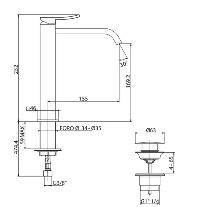 Gattoni ELY Смеситель для раковины H232 мм, излив 155 мм, цвет: хром