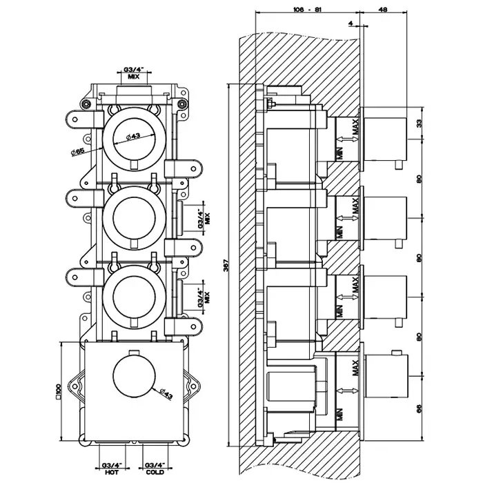 Gessi 316 Bath-Shower Термостат для душа встраиваемый на 2 потребителя, цвет: steel brushed 54234#239
