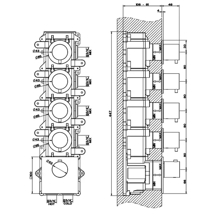 Gessi 316 Bath-Shower Термостат для ванны встраиваемый, 4 потребителя, цвет: steel brushed 54508#239