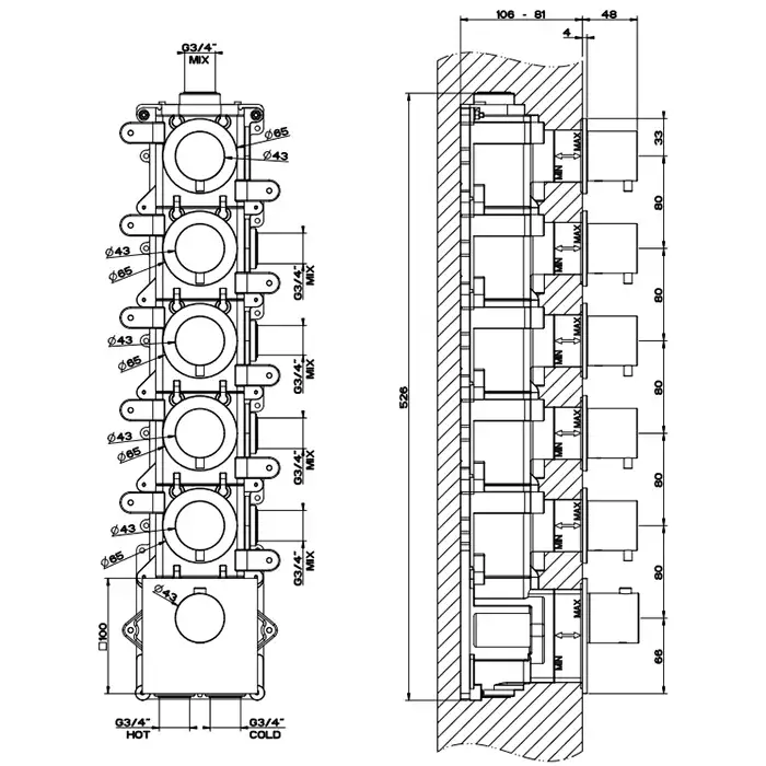 Gessi 316 Bath-Shower Термостат для ванны встраиваемый, 5 потребителей, цвет: steel brushed 54510#239