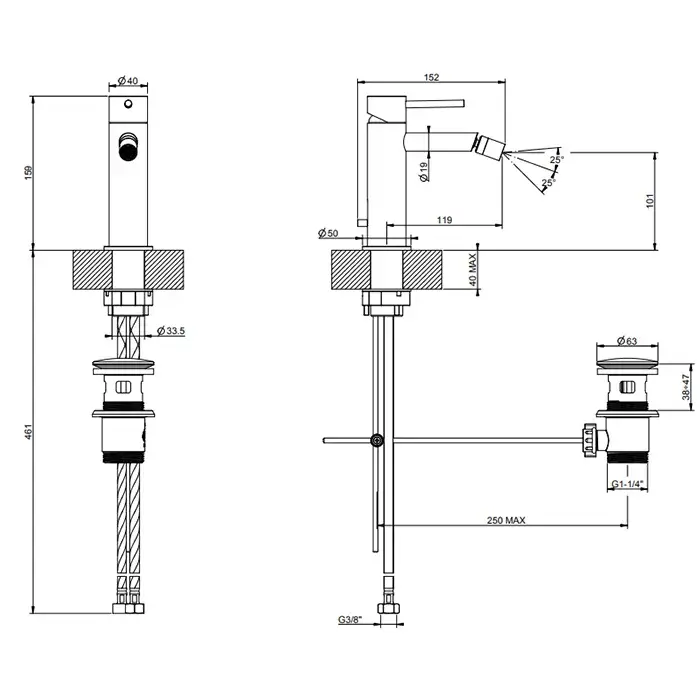 Gessi 316 Flessa Смеситель для биде, однорычажный, с донным клапаном, цвет: black metal brushed PVD 54007#707