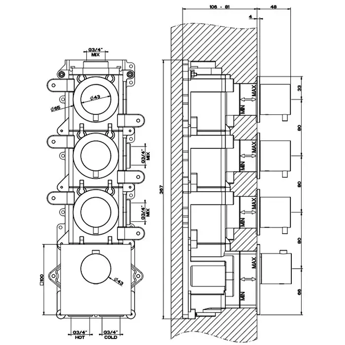 Gessi 316 Смеситель для душа термостатический 3 потребителя, встраиваемый, цвет: matte black 54506#299