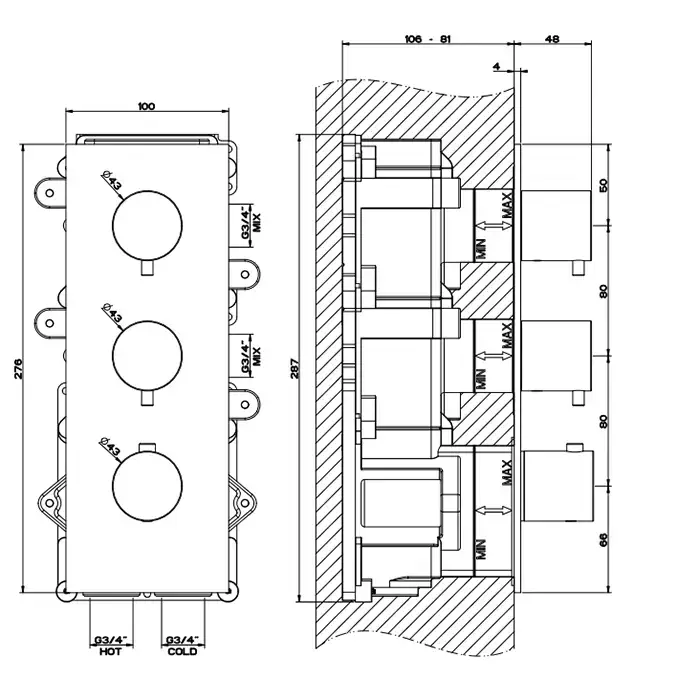 GESSI 316 Встраиваемый термостатический смеситель на 2 источника, резьба 3/4" (внешние части), цвет: brushed black metal pvd