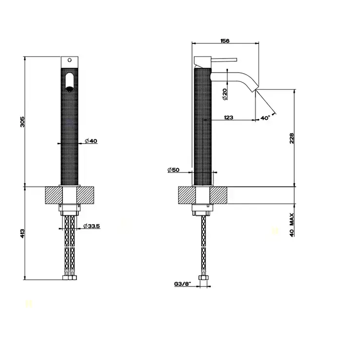 GESSI 316 Смеситель для раковины на 1 отверстие, высокий, h=305мм, без донного клапана, излив 123мм, цвет: steel brushed