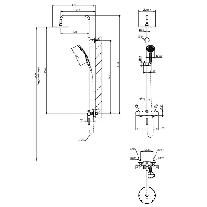 Gessi Emporio Shower Душевая стойка: термостат, верхний душ 20 см, лейка, шланг 150 см, цвет: chrome 35181#031